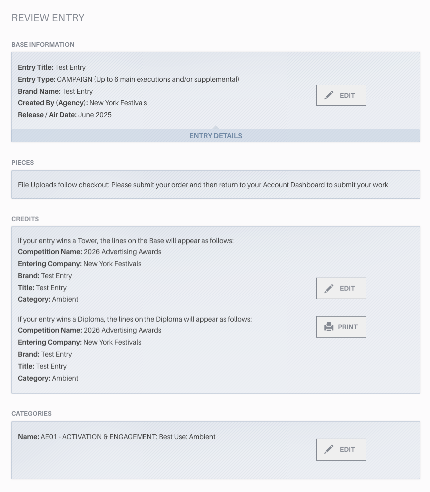 The “Review Entry” page will detail your Base Information, Pieces, Credits, Categories, and Additional Information (if applicable). Please make sure these details are correct. When you are ready, click the “ADD ENTRY TO CART” button to proceed.