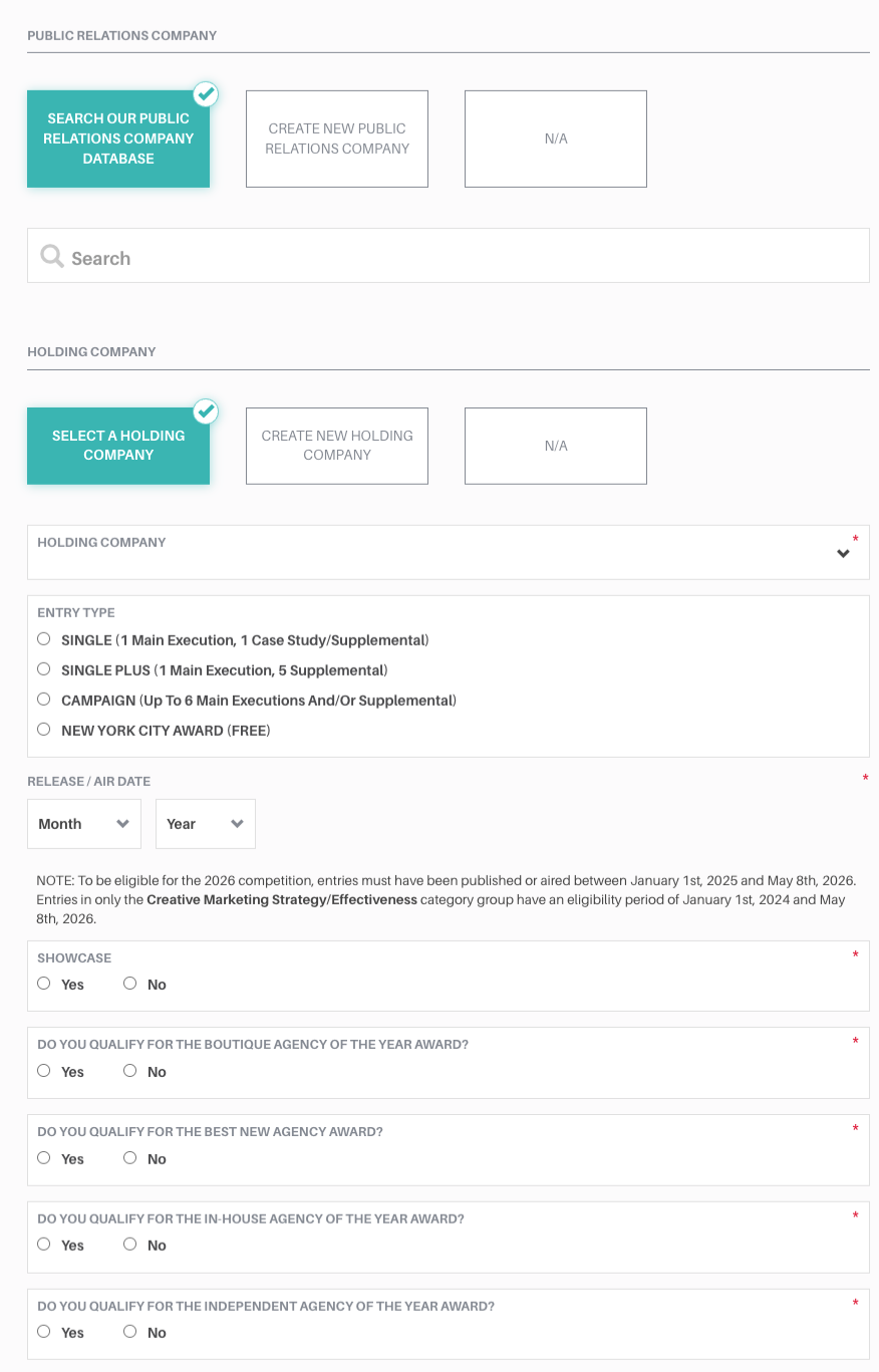 To be eligible for the 2026 competition, entries must have been published or aired between January 1st, 2025 and May 8th, 2026. Entries in the Creative Marketing Strategy/Effectiveness category group have an eligibility period of January 1st, 2024 and May 8th, 2026.