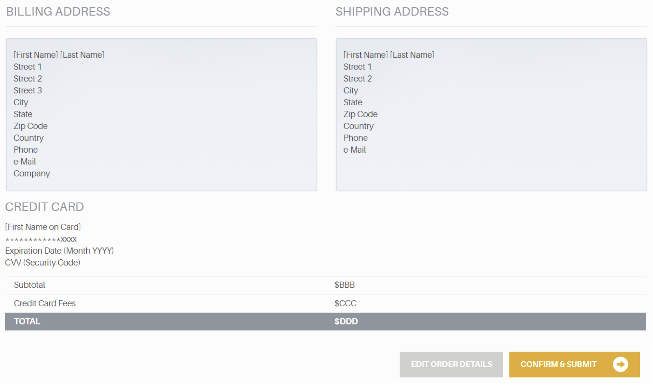 Once you have completed all of the fields in Checkout, you can give a final review of your billing and shipping addresses before you confirm and submit your order to close your cart.