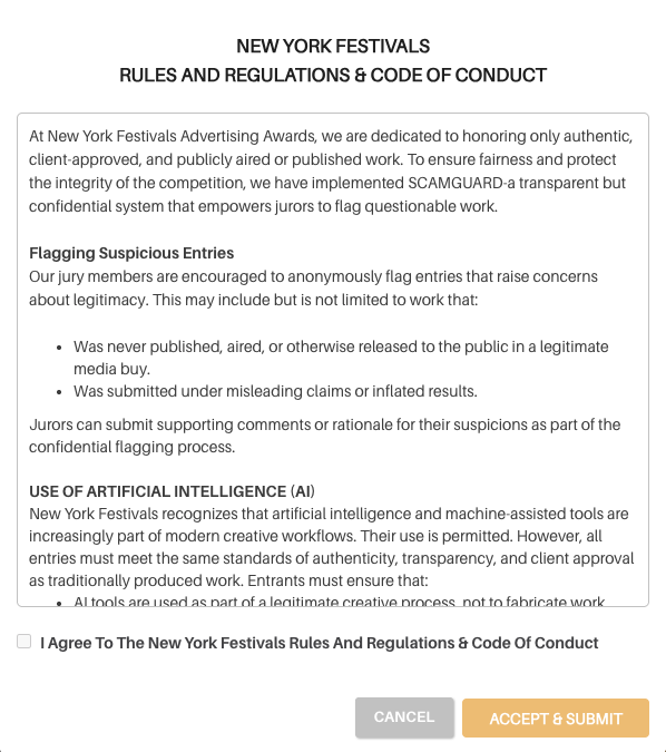 New York Festivals reserves the right to request disclosure or clarification regarding the use of AI tools as part of its investigation and review process. Failure to provide accurate information, or the use of AI to simulate, fabricate, or disguise non-existent work, will be treated as a violation of these Rules and Regulations and may be subject to the same penalties as confirmed scam advertising.Before closing your cart to pay you will be asked to accept these policies with a check box that states