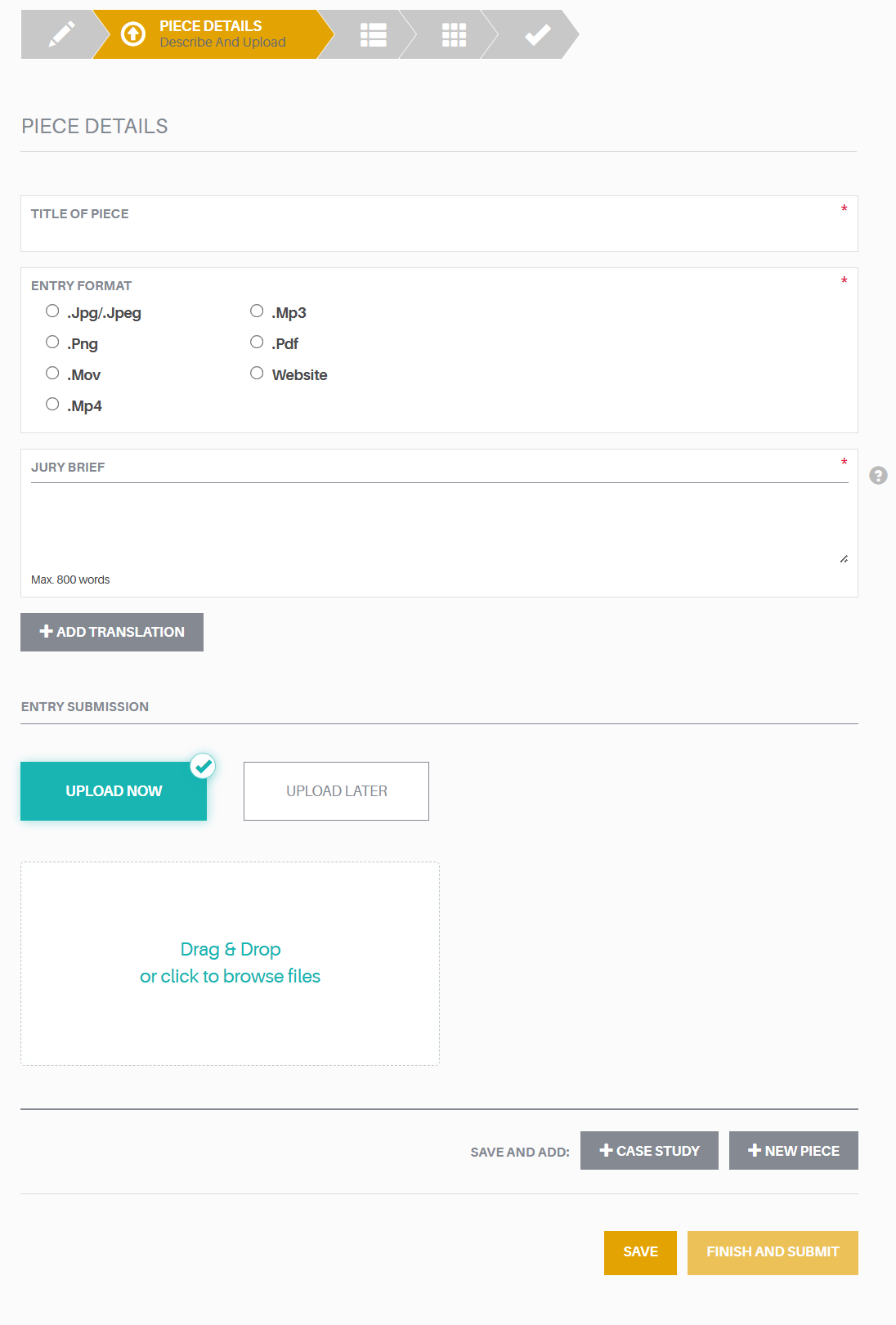 Once you are satisfied with your entry's status, use the yellow "Finish And Submit" button at the bottom of the page to mark your entry complete and submit it for judging.